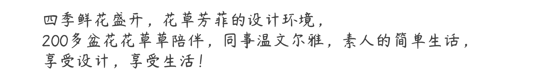 四季鮮花盛開,花草芳菲的設計環境,200多盆花花草草陪伴,同事溫文爾雅,素人的簡單生話,享受設計,享受生活!