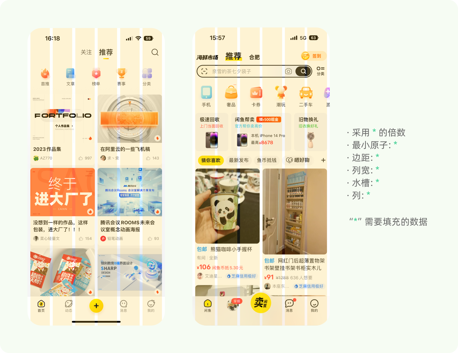 柵格的規(guī)則定義了一套底層的、統(tǒng)一的測量單位,當(dāng)設(shè)計(jì)團(tuán)隊(duì)內(nèi)對(duì)此達(dá)成共識(shí)時(shí),可以避免因屏幕適配、比例換算產(chǎn)生的像素偏移,適配多種屏幕,提升設(shè)計(jì)稿件中元素屬性的一致性和規(guī)范化。