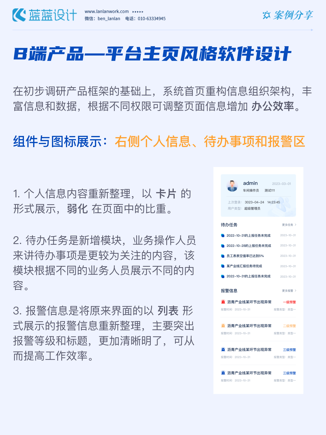 方案二:平臺主頁風格 在初步調研產品框架的基礎上,系統首頁重構信息組織架構,豐富信息和數據,根據不同權限可調整頁面信息增加辦公效率。設計風格采用簡約的設計語言,模塊化布局,方圓并構的設計模式,界面強調可復用性和通用性,配色采用品牌色,品牌融合度高。