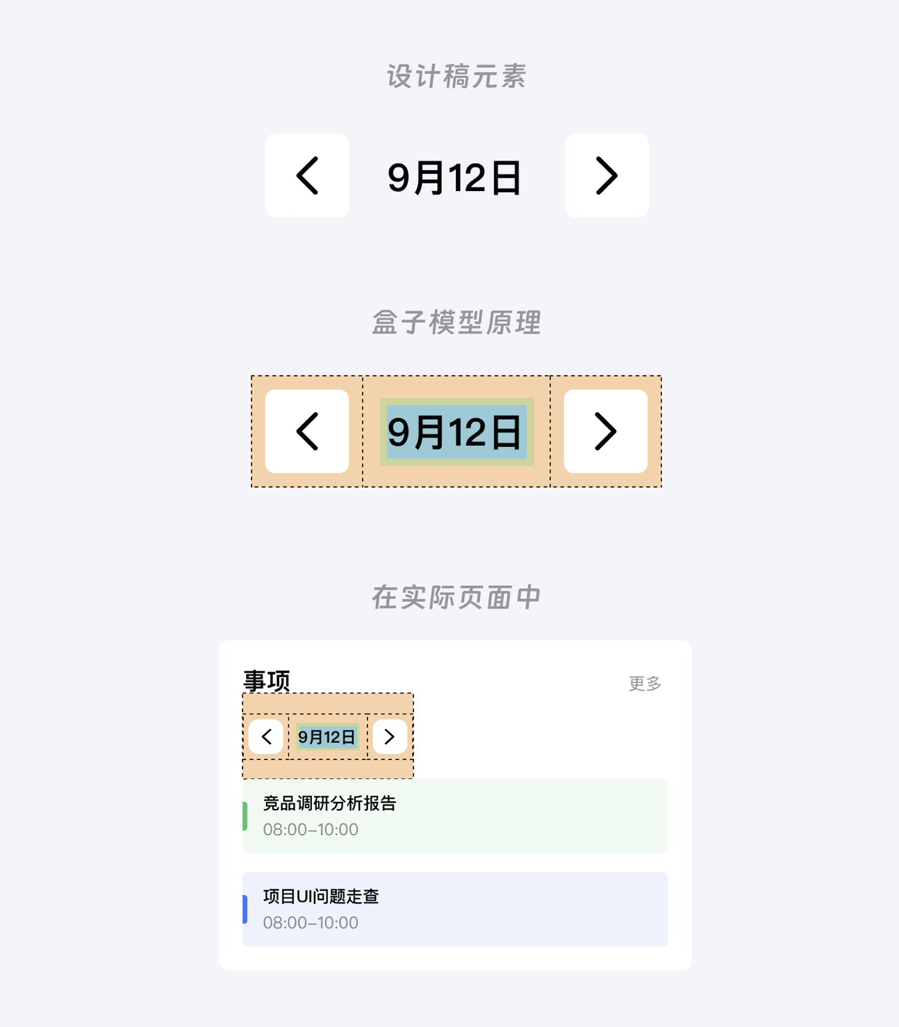 - 案例實操:以 “9 月 12 日” 的日程元素為例,其內容(如事項名稱、時間)對應 content,內容與邊框的距離為 padding,元素邊框為 border,與其他元素的間距為 margin。通過調整這些屬性,可讓元素按設計稿布局整齊排列。