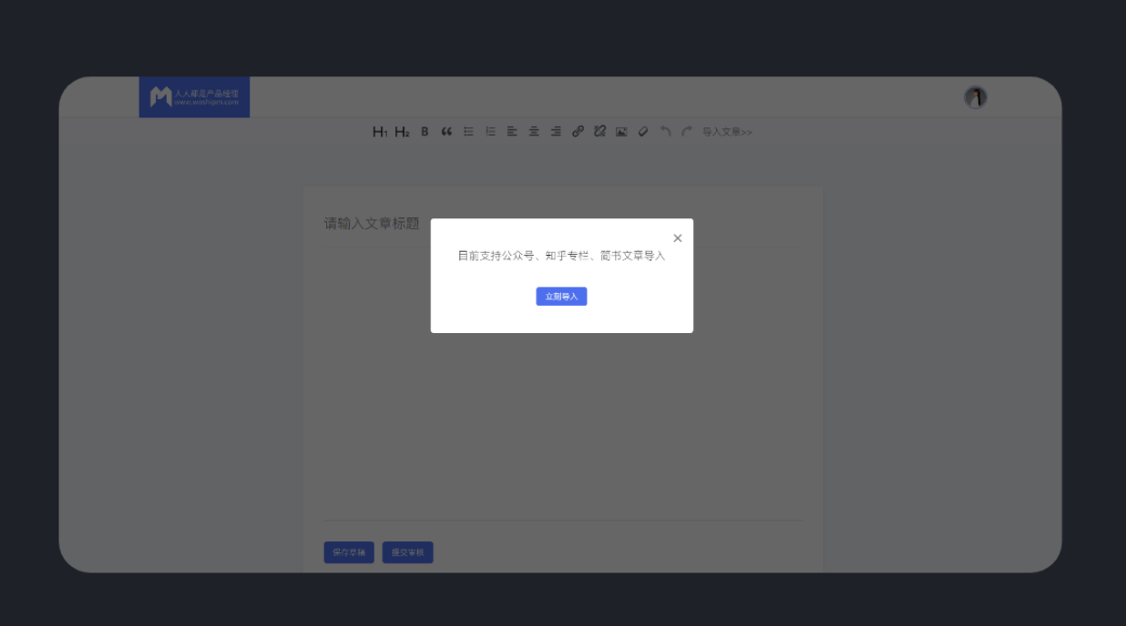 好用的 B 端產(chǎn)品能顯著提升用戶操作效率,讓工作如行云流水般順暢。反之,難用的產(chǎn)品就像用鈍刀切黃油,不僅效率低下,還會讓人心情煩躁。“人人都是產(chǎn)品經(jīng)理” 的文章投稿發(fā)布頁面設(shè)置了文章導入功能,支持從公眾號、簡書、知乎專欄導入文章,大大節(jié)省了投稿人編輯文本和排版的時間,減少了重復排版的麻煩,也提高了人們的投稿意愿。