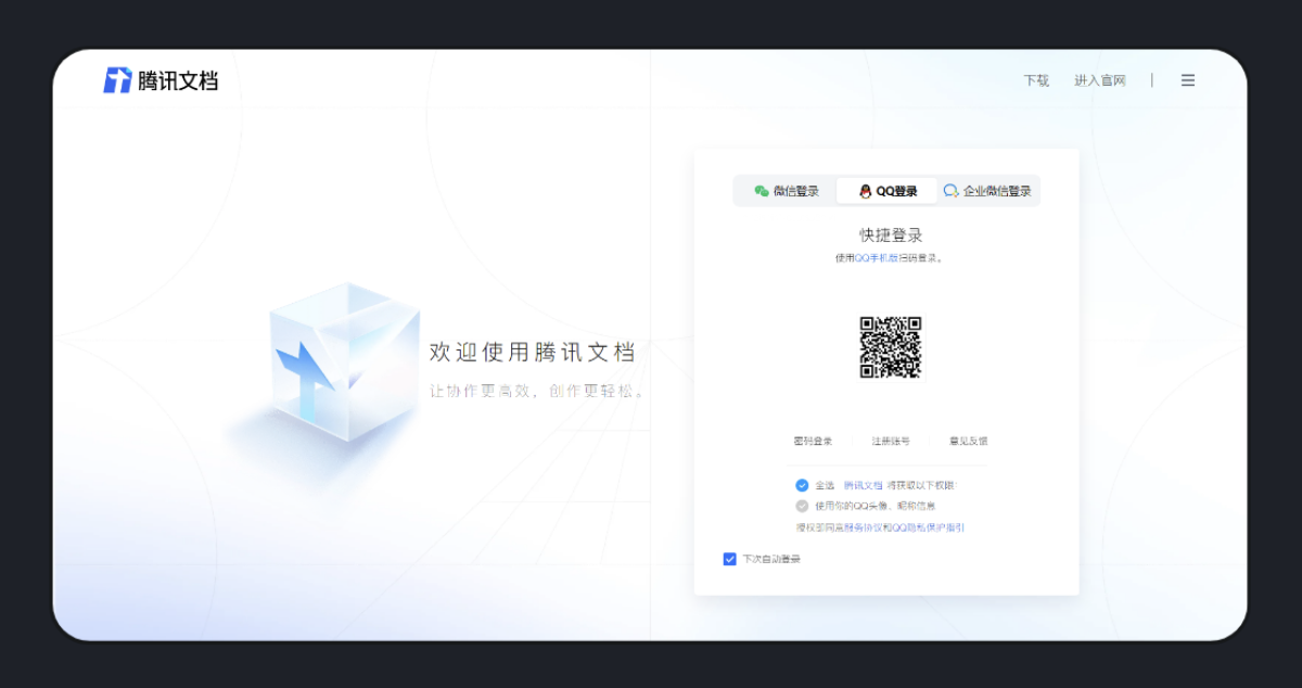 在符合業(yè)務邏輯的基礎(chǔ)上,體驗設(shè)計能優(yōu)化 B 端產(chǎn)品復雜的流程,將復雜的迷宮簡化成一條直線,讓用戶操作界面時感到暢通舒適。騰訊文檔的登錄頁沒有讓用戶輸入一連串的賬號和密碼,而是采用二維碼方式,用戶掃碼即可登錄,快捷又方便,大大簡化了登錄流程。