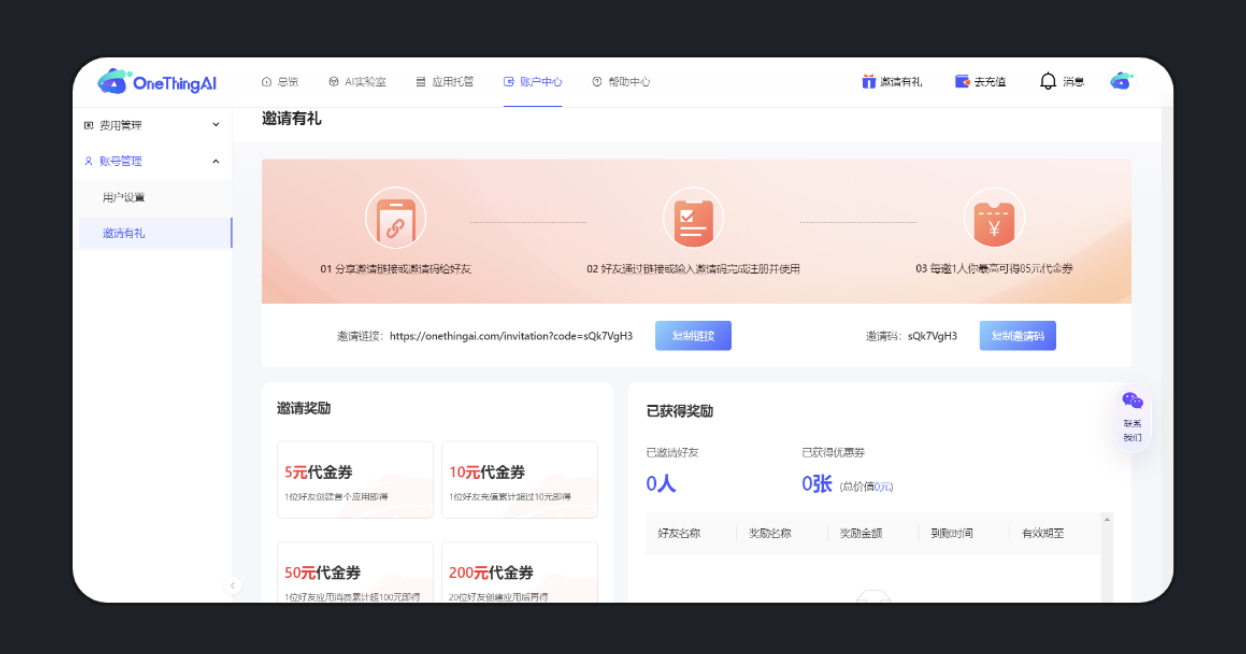 對于 SaaS 產(chǎn)品,在滿足業(yè)務場景的前提下,良好的體驗如同口碑的種子,會不斷生根發(fā)芽,讓更多人愿意付費并推薦給朋友,使產(chǎn)品像茁壯成長的樹一樣不斷吸引新養(yǎng)分。oneThingAI 推出的 “邀請有禮” 活動,會員推薦他人可獲得相應代金券,再加上工具本身體驗好、便捷易上手,在優(yōu)惠活動期間,吸引了眾多 AI 愛好者注冊購買,有效促進了產(chǎn)品銷量增長。