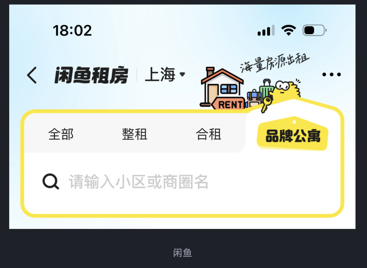 傳統租房板塊多以 “文字 + 普通卡片” 呈現,用戶需先讀文字才能識別功能;閑魚則直接將 “房屋結構” 轉化為視覺符號 —— 卡片上用簡化的房屋輪廓圖標替代傳統標簽,配合 “RENT” 英文標識,讓用戶一眼就能關聯 “租房” 業務。這種設計不僅強化了業務屬性,還通過圖形化降低了信息識別成本,同時獨特的視覺符號也加深了用戶對產品的記憶度。