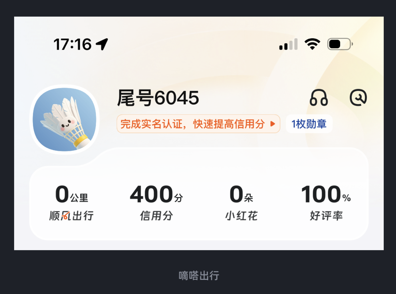 不同于傳統的圓形或方形頭像,嘀嗒采用 “超橢圓頭像”,并將其與個人信息卡片的左上角凹陷處精準匹配 —— 頭像的邊緣與卡片凹陷完美貼合,仿佛 “嵌” 在卡片里。這種設計既突出了頭像這個核心元素,又避免了傳統布局中頭像與卡片之間的負空間浪費,讓整體結構更緊湊飽滿。同時,卡片內信用分、小紅花、好評率等信息圍繞頭像有序排布,視覺流自然且不雜亂。