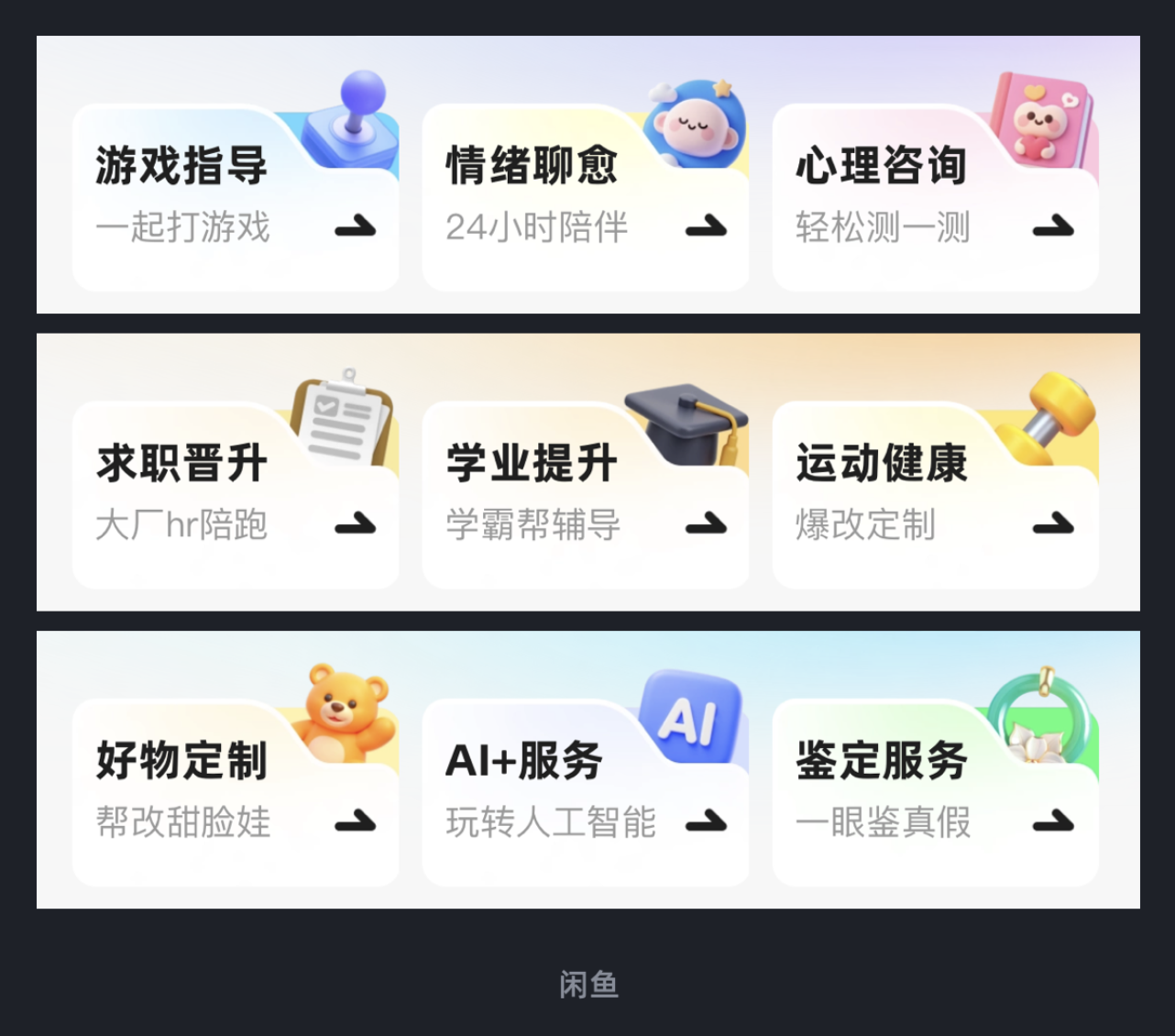 閑魚的副業模塊(如游戲指導、情緒聊愈、心理咨詢)采用 “異形卡片” 設計:每張卡片的右上角都做了凹陷處理,將功能圖標嵌入凹陷處,形成 “卡片 - 圖標” 的第一層關聯;同時,每張異形卡片下方又疊加了一層淺色調的背景卡片,通過色彩深淺和輪廓差異,形成 “背景卡片 - 異形卡片 - 圖標” 的三層結構。這種設計不僅讓每個副業模塊的邊界更清晰,還通過 Z 軸層級的差異,避免了多模塊排列的呆板感,用戶能快速識別不同功能。