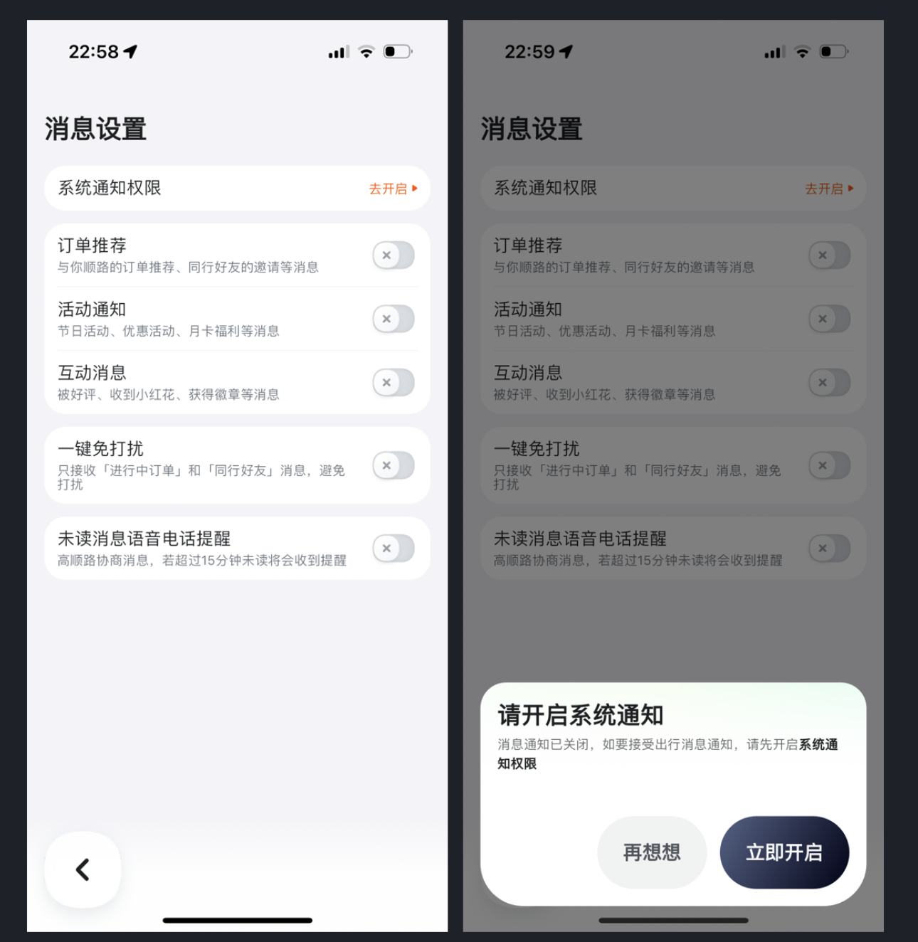 “引導用戶開啟系統通知” 是很多 APP 的剛需,但傳統設計多采用 “強硬引導”(如 “去開啟” 按鈕),忽略了用戶 “怕打擾” 的核心顧慮,反而導致用戶反感。嘀嗒出行的通知設置設計,卻用 “一鍵免打擾” 的選項,做到了 “產品需求” 與 “用戶體驗” 的平衡。
