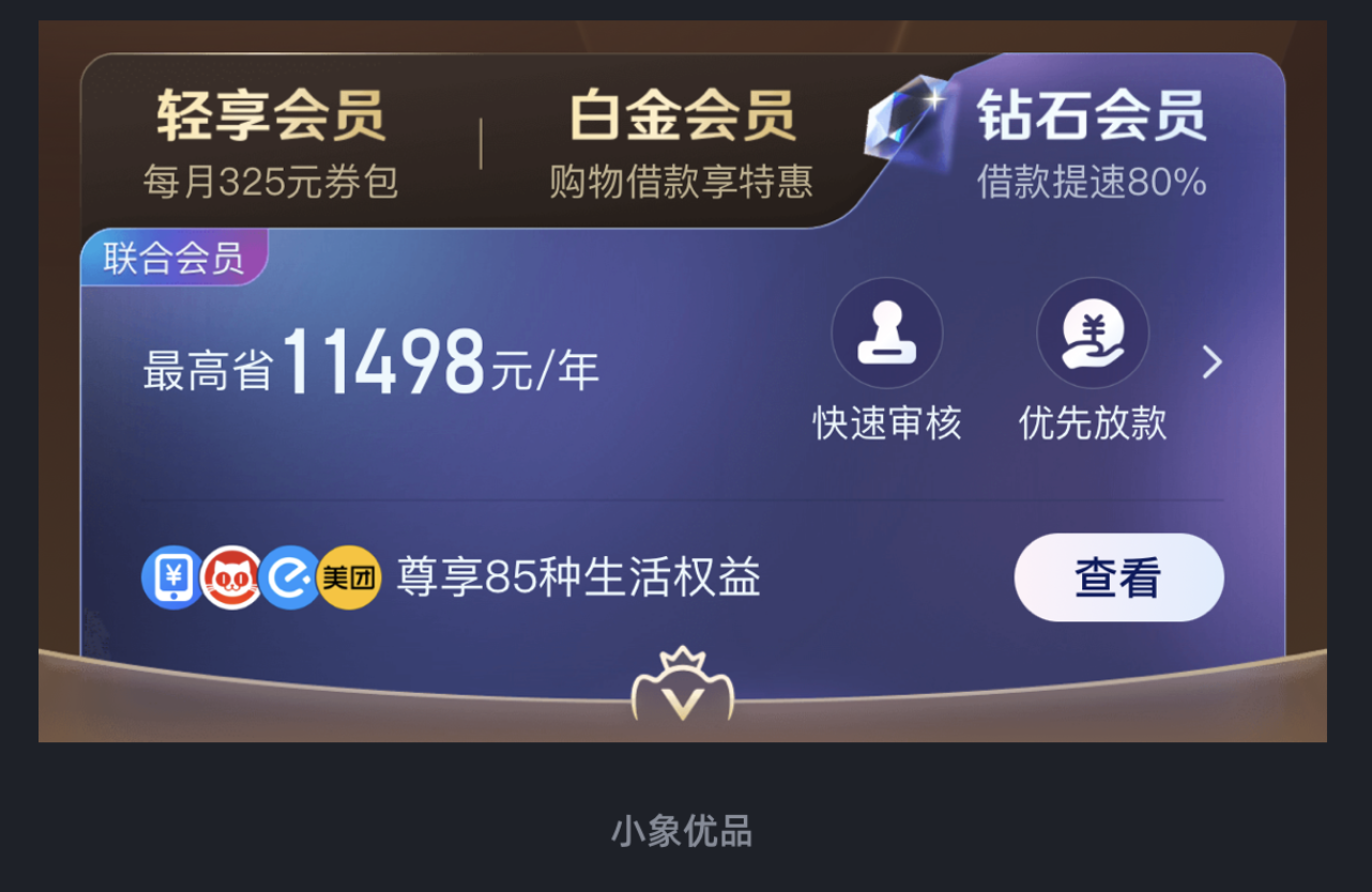 小象優品的會員卡片采用 “異形結構”—— 不同等級的卡片(輕享會員、白金會員、鉆石會員)有不同的輪廓弧度,邊緣處加入了細膩的光影漸變(如鉆石會員卡片邊緣有更強的光澤感),配合卡片內部的漸變背景,形成 “卡片 - 光影 - 背景” 的三層質感。這種設計不僅讓不同等級的會員卡片一眼可辨,還通過精致的光影細節,讓卡片從 “平面圖形” 變成 “有質感的實體”,間接傳遞 “會員身份尊貴” 的心理暗示。