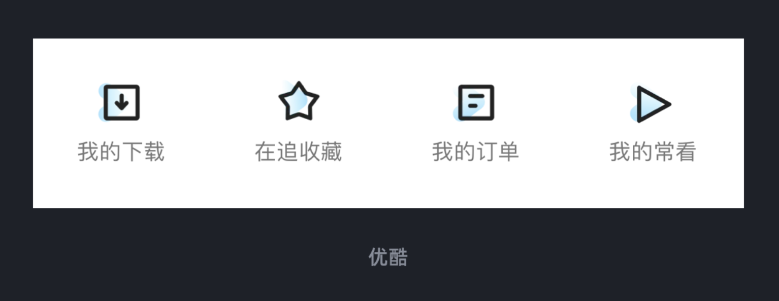 比如優酷個人中心的圖標 ——“我的下載”“我的訂單” 這些功能按鈕,都采用簡潔的線性風格,但在圖標的底層悄悄疊加了優酷的品牌圖形元素。這種 “線性 + 品牌點綴” 的設計,既保持了界面的清爽感,又讓圖標跳出了 “千篇一律” 的困境,用戶看到圖標時,會下意識聯想到 “這是優酷的設計”,慢慢形成記憶點。