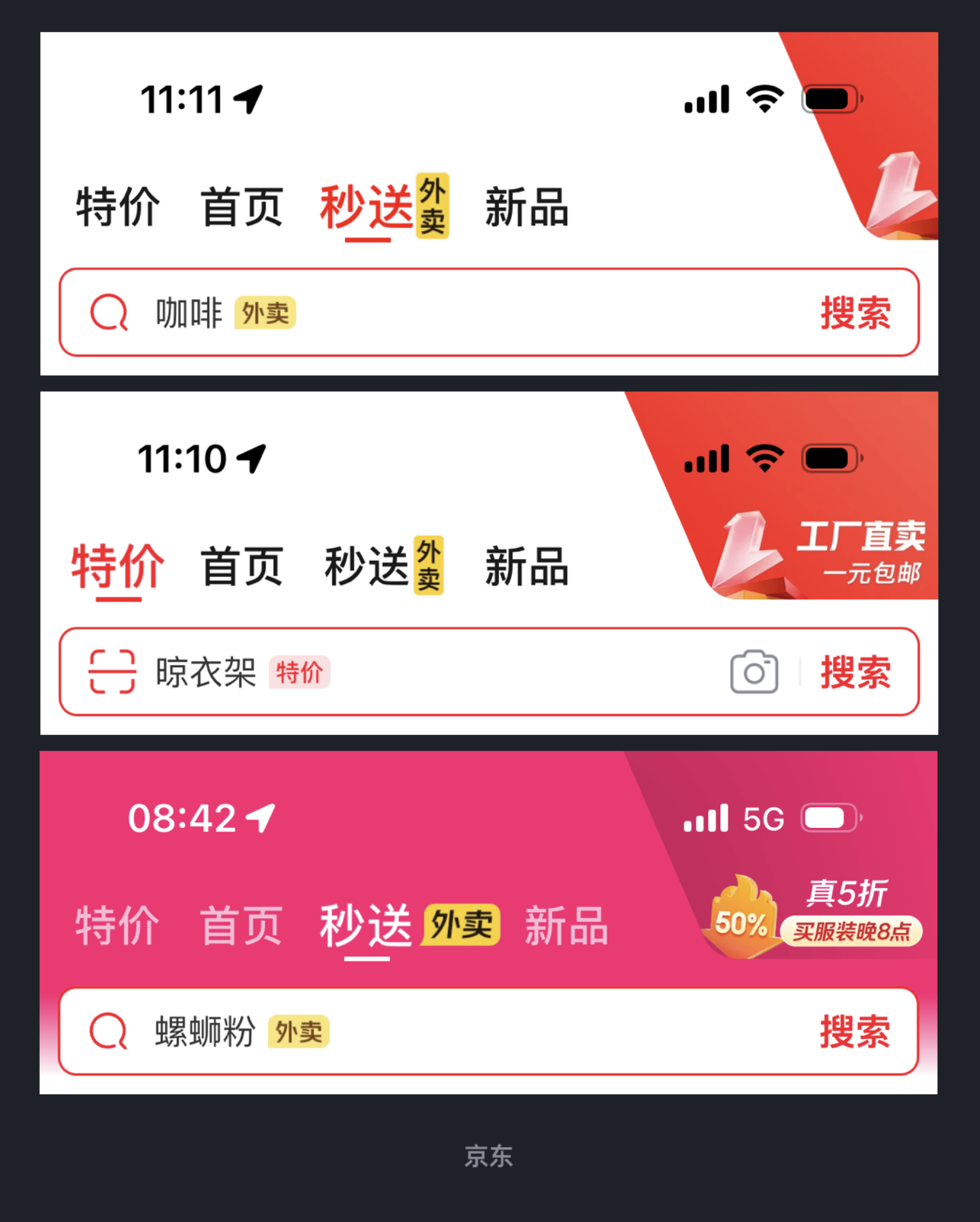 之前京東外賣還沒加入 “秒送” 欄目時,導航欄的布局有些失衡:左側是 “特價”“首頁” 等功能入口,右側只有搜索框,中間和右側有不少空白。后來京東把外賣業務納入 “秒送” 欄目,在導航欄右側加了一個 “外賣” 營銷入口 —— 這個小小的改動,不僅讓導航欄左右布局更對稱,還充分利用了之前的空白區域,拓展了營銷接口。用戶點進 “外賣” 就能直接下單,不用再從首頁層層尋找,既提升了轉化,又讓界面更規整。