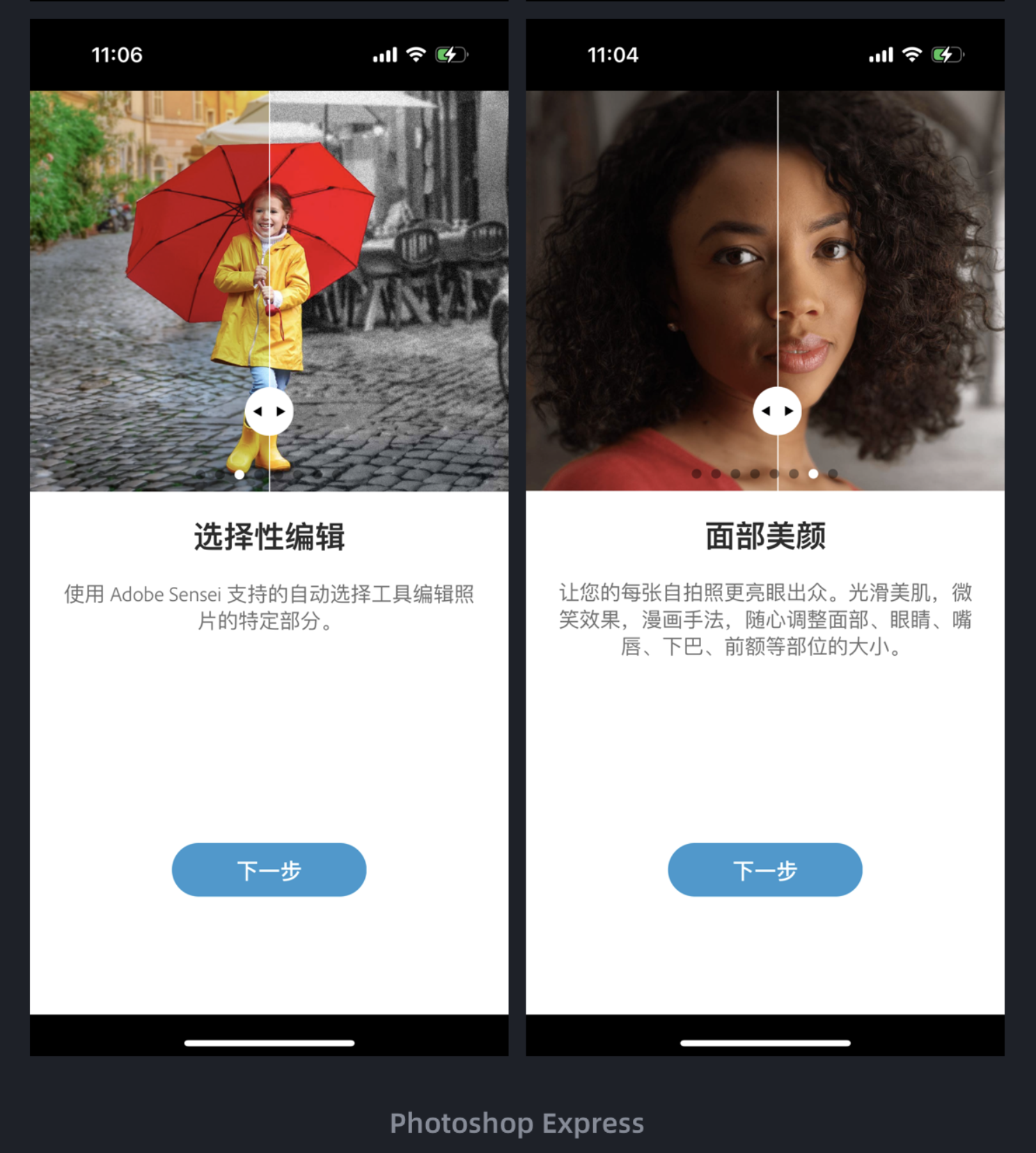 很多產品的引導頁、功能介紹,都喜歡用 “靜態圖文”,用戶看了容易忘,也感受不到功能的實際價值。但 Photoshop Express 的引導頁設計,卻用 “互動” 讓功能優勢變得直觀 —— 用戶不用 “看說明”,而是 “親身體驗”。