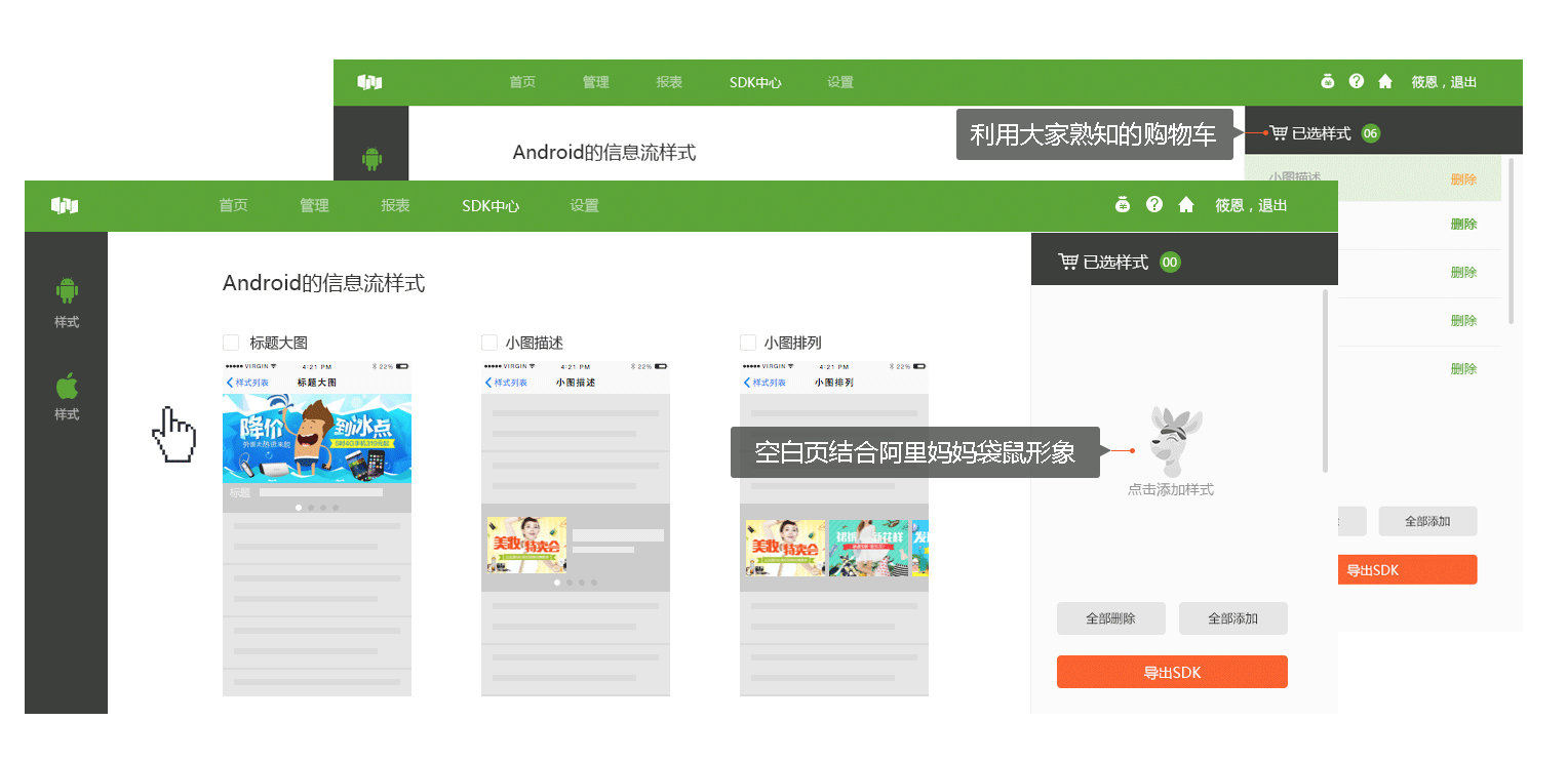 在新品介紹中加入了阿里媽媽袋鼠的品牌形象,一方面做到了,品牌的滲透。阿里媽媽袋鼠吉祥物在PC產(chǎn)品端落地的,另一方面可以通過帶有表情的卡通形象,傳達(dá)給用戶相關(guān)的信息。