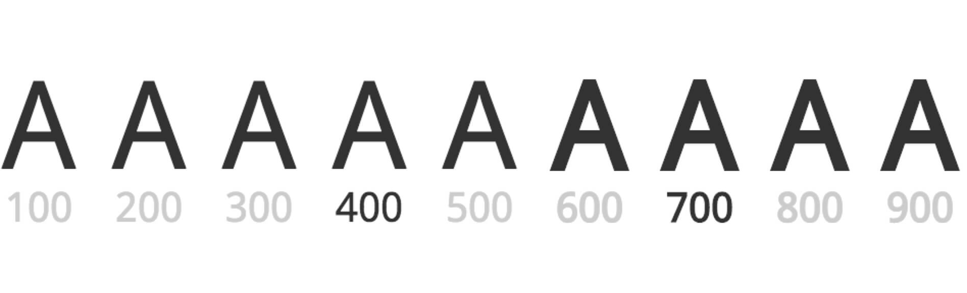 也就是100、200、300、500會表現為跟400同一種字重,600、800、900會表現為跟700同一種字重。