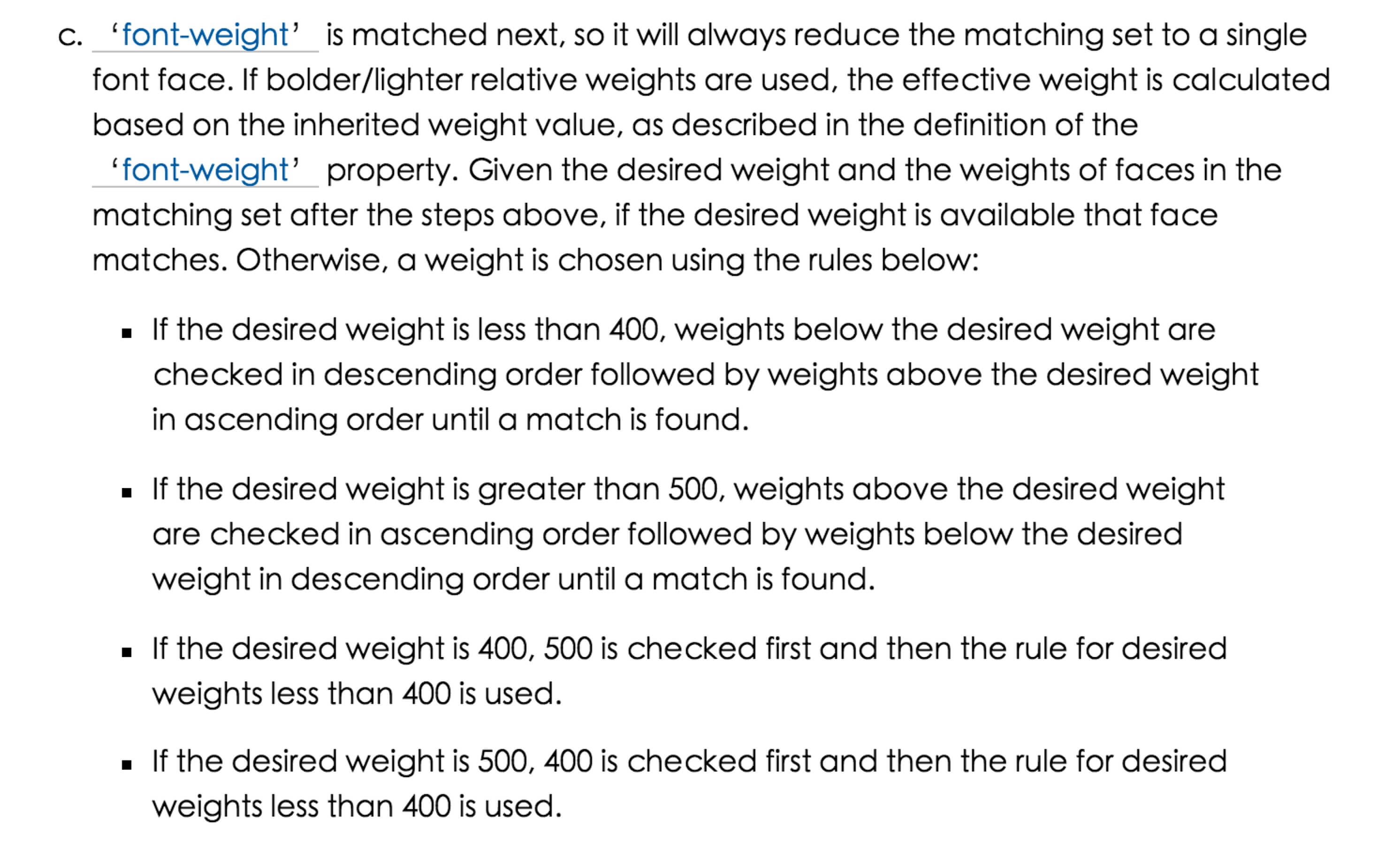 為什么呢?根據結果表現,我們可以反推出,字重在瀏覽器去渲染時早已經按照算法去一一匹配好。也就是,400匹配的字重在500匹配之前已經匹配好了(說起來有點拗口,大家可以根據Figure.16的例子體會下)。